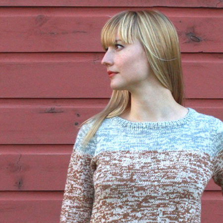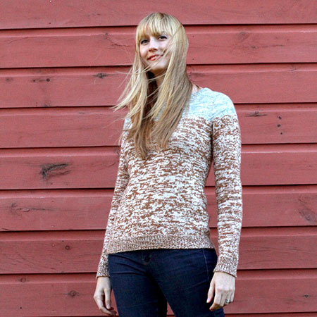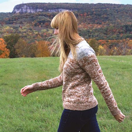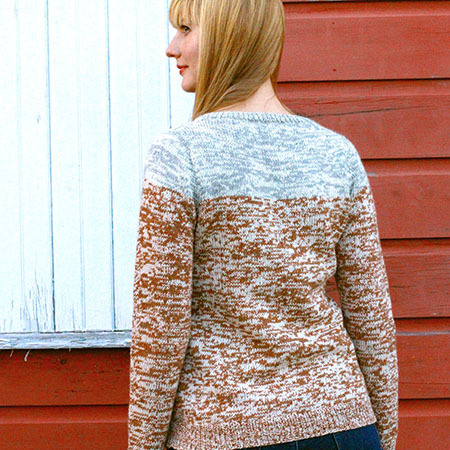 This classic crew neck pullover has an unusual top-down seamless set-in sleeve construction that is fun to knit and practically fail-proof. The design features a mottled texture effect that is produced by holding two strands of contrasting colored yarn together. Top-down construction allows for easy length adjustment and a personalized fit.