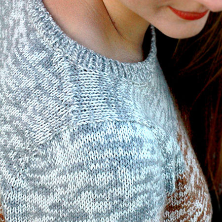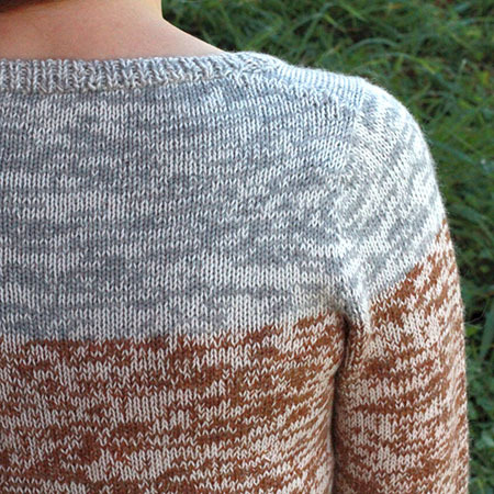 The pattern begins with a small flat-knitted panel that spans the back of the shoulders. Parts are added to this back panel to eventually incorporate the whole shoulder area including the sleeve caps. Then, the sweater is worked circularly in rounds from the top of the sleeve caps to the hems.