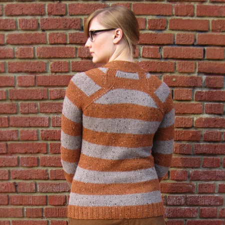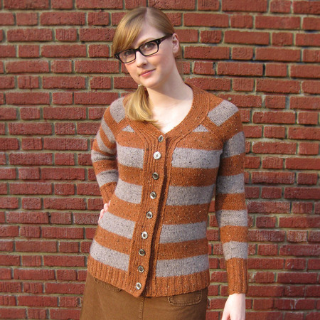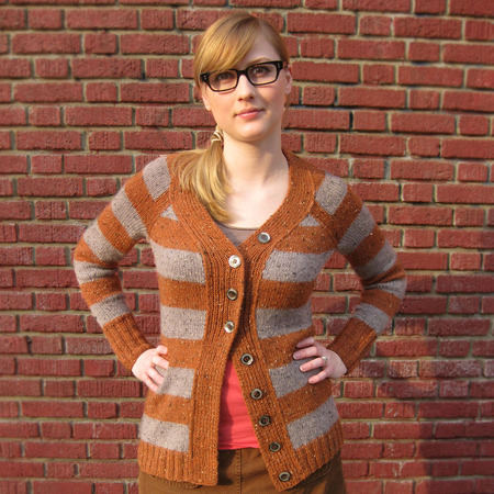 The main part of the sweater is knitted back and forth on circular needles and the sleeves are worked in the round. The button band is knitted separately and attached at the end.
