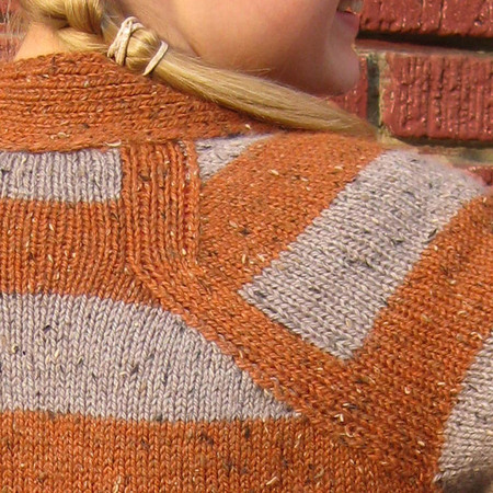 This seamless sweater has a modern look with an easy fit through the body, gentle shaping at the waist and slim fit through the arms. The unusual shoulder construction is accentuated by an optional vertical intarsia stripe.