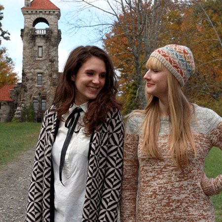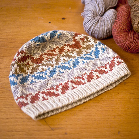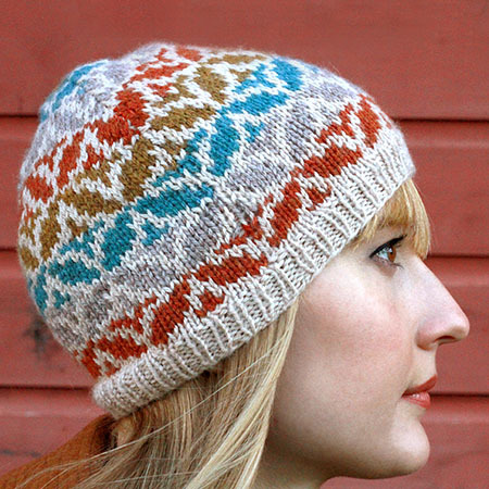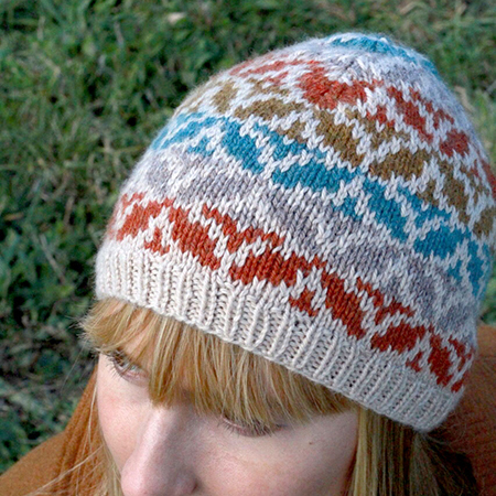This adorable hat features a vintage-inspired geometric fair isle motif with a cheerfully colored striped background. The hat is worked in the round from a chart with easy to understand integrated crown shaping, and comes in two sizes; fitted and slouchy. Only 25-30 yards of DK weight yarn is needed for each background stripe, so this is a great stash-busting project.
