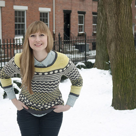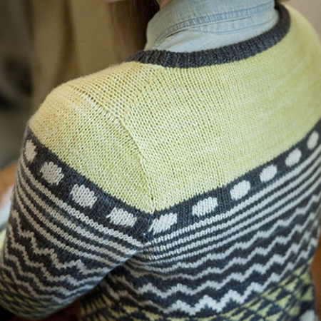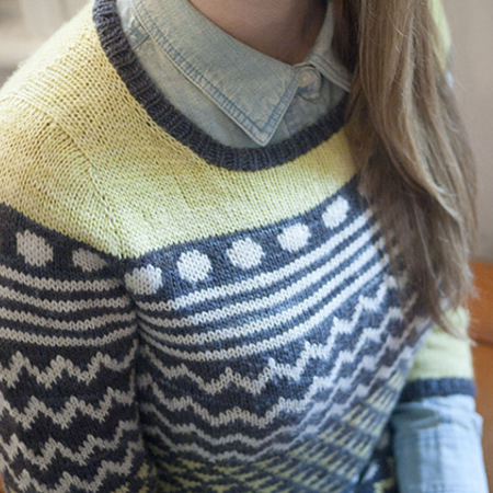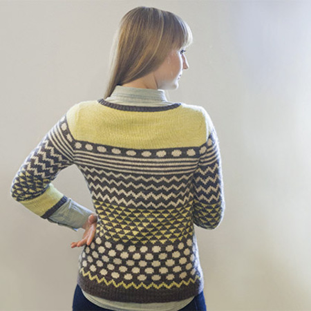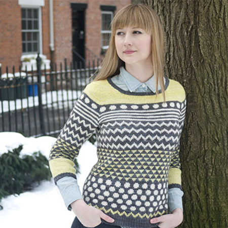 The Brewster Pullover has a very unusual top-down seamless set-in sleeve/shoulder construction that is practically fail-proof. The design also features playful geometric color-work motifs that are easy to memorize. Top-down construction allows for easy length adjustment for a personalized fit.