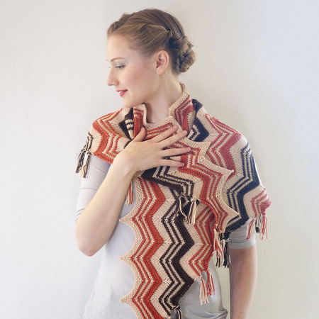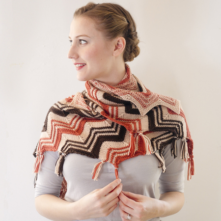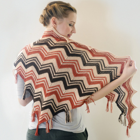 This beautiful and exotic looking shawl is begun at the center point and expands outward with a zig-zag stripe pattern. The tassels are formed as you knit by cutting a length of yarn at the beginning and end of each row, eliminating the need to weave in any ends (yay!)