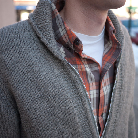 A: I bought a YKK one-way separating zipper in size 8 (that’s how many mm across the teeth are) with silver aluminum teeth, cut to 20”. It’s really heavy duty, but I like that look on a man’s garment. I don’t think they sell it in gray anymore, but you can find a similar one here. I buy all my zippers from that shop, Pacific Trim. You can even send a swatch of your yarn to the shop, and they will select a zipper color to match for you!