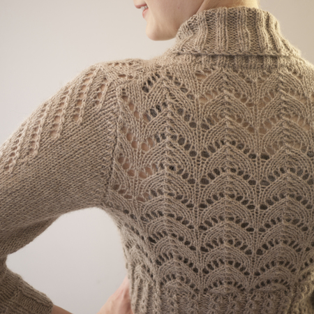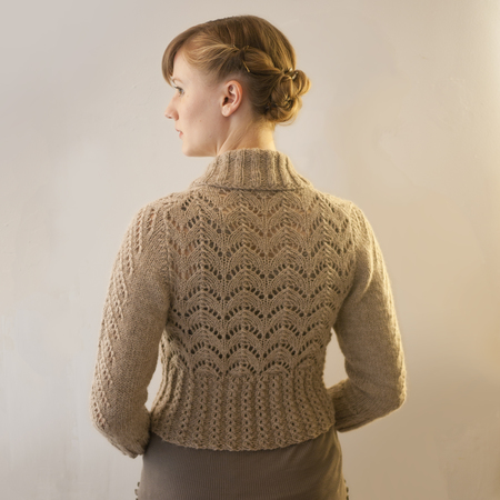 This pattern will keep your interest with easy to memorize simple lace panels in small sections, all knitted from charts. The cabled eyelet edging around the lower edge is surprisingly simple and doubles as a button-hole role.