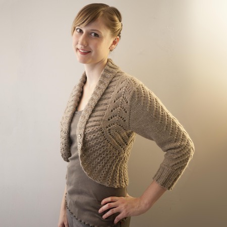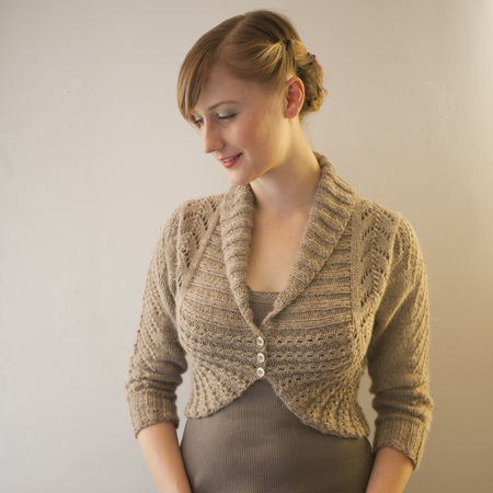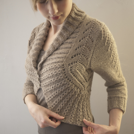 The Georgina Cardigan is sweetly feminine with a soft vintage feel. Captivating details like the cabled eyelet edging and off-set shoulder construction make this pattern a timeless treasure. The 3/4 length sleeves are easily modified to full length and feature a delicate chevron lace panel. The Georgina Cardigan will dress up any outfit and looks equally beautiful worn open or closed.