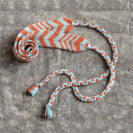 This reversible belt features a chevron stripe pattern and a braided tie for closure. Show off the stripe pattern by wrapping the belt backward with the bow in the back like an obi belt. Worn in any orientation, it looks great over a long tunic to add a little waist definition, or through the belt loops of your favorite jeans. This is a great project to keep in your purse because of its small size, and the pattern is easy to memorize.