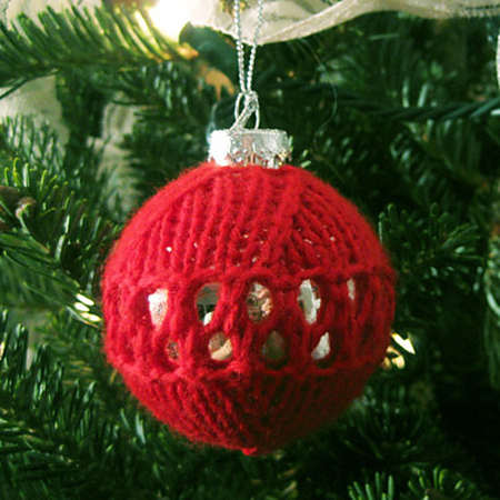 Add a soft cozy touch to your Christmas tree this year with this adorable ornament pattern. This quick easy pattern would also make a fantastic gift. All you need is some left over yarn, a glass or plastic sphere shaped ornament (any size), and about 1/2 an hour. The cozy is knitted flat in stockinette stitch with an eyelet band around the center.