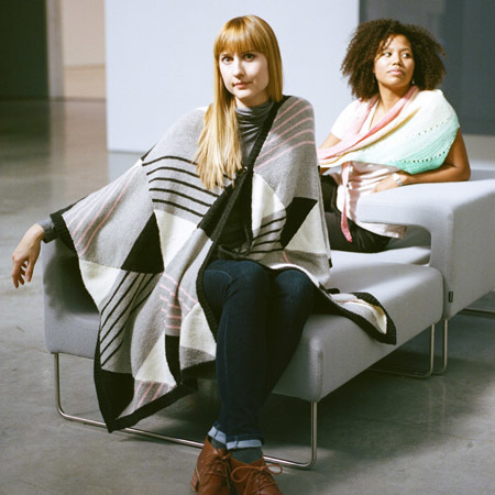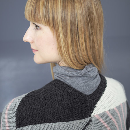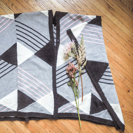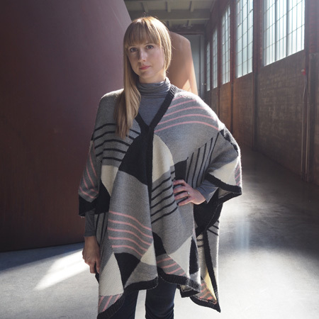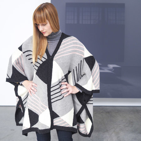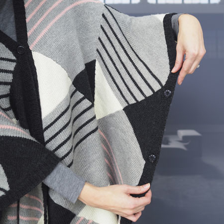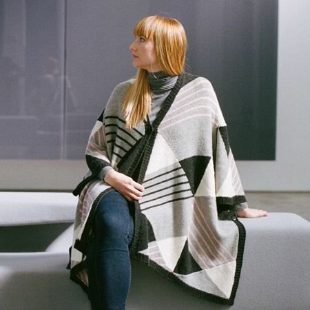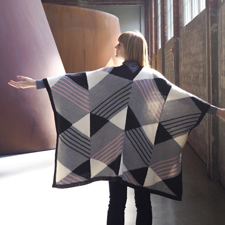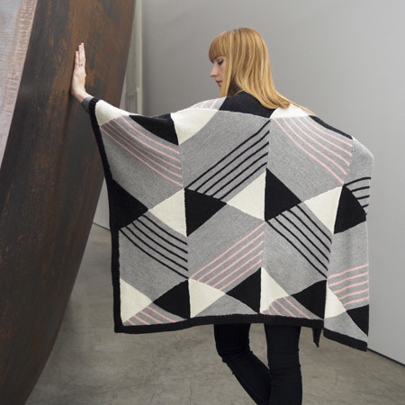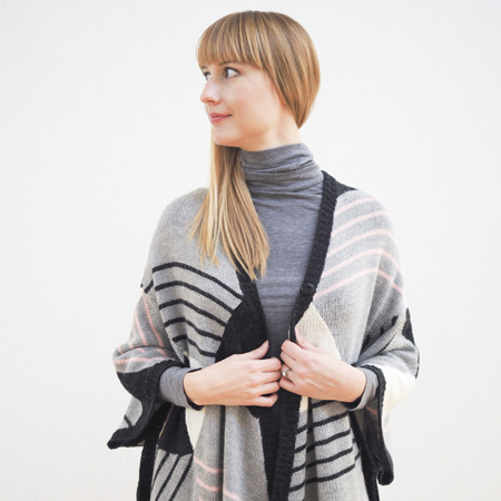 This cozy kimono-style cardigan features a striking hexagon and diamond tiled motif. The pattern is cleverly constructed much like a quilt, by arranging many striped diamond pieces at different angles to create a dynamic visual effect. The finished garment has a simple rectangular shape similar to a blanket, but split down the front to create an opening like a cardigan. The pattern consists of 16 diamond shaped pieces, and 8 smaller triangular pieces that are sewn together, and a knitted-on border with button closures on the front and sleeve openings.