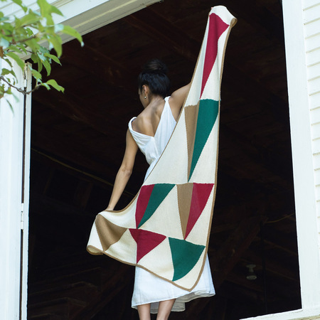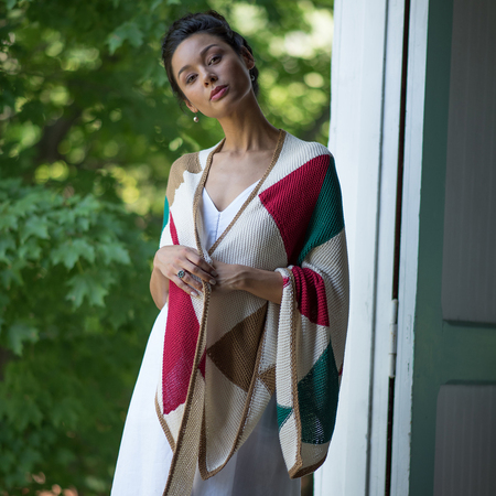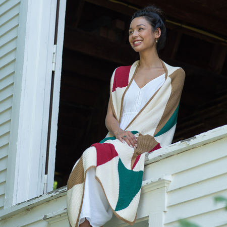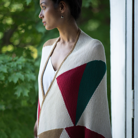Geometric shapes made using short rows make up this asymmetrical triangular shawl. Knit in sections and seamed.