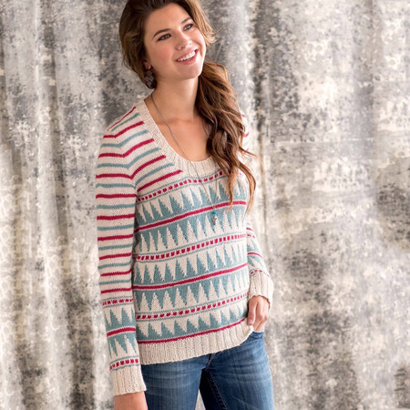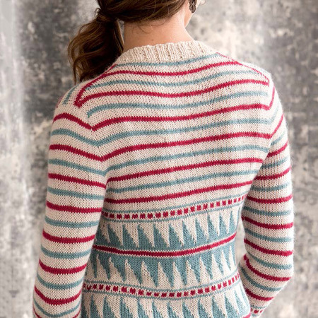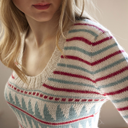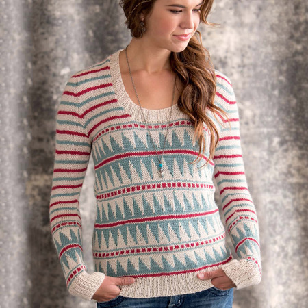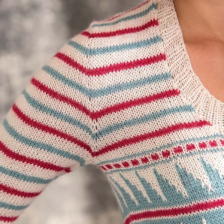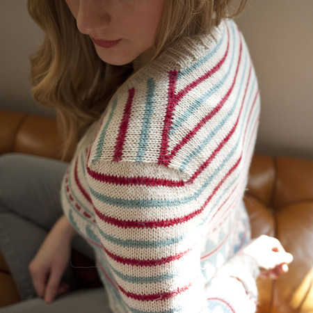 This top-down, completely seamless pullover sweater features a geometric color work pattern around the body and cuff and stripes on the shoulders and back. This sweater’s unusual topdown construction includes set-in sleeve caps that are worked at the same time as the rest of the shoulder. This unusual construction allows for the stripes to be perfectly matched and is also a lot of fun to work! The pieces of the shoulder are done in sections that grow from pick-up stitches, which helps to add a bit of extra structure right where it is needed most.