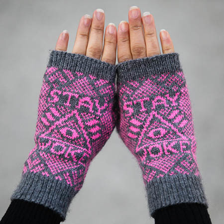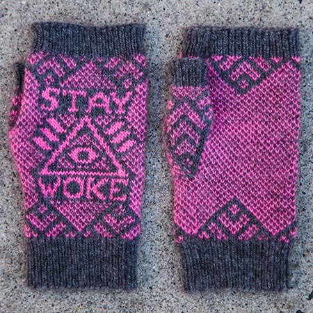 Complacency is the enemy of progress; the words and symbols knitted into these mitts serve as reminders of this profound message. The phrase “stay woke” has become a rally cry for the social justice-minded, and particularly for matters of racial injustice. We must keep our eyes open, and stay focused on the issues that are important. The pyramid symbol depicted on the mitts is called the “all-seeing eye of providence”, and in this context also represents the importance of maintaining awareness —seeing the hidden, being aware of the whole story. This symbol has been associated with the United States seal since 1776, and connects this modern message to the core issues this country has been wrestling with since it was formed. Meditate on this message as you knit these mitts, and let them inspire you to make a difference.
