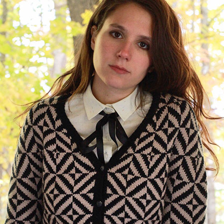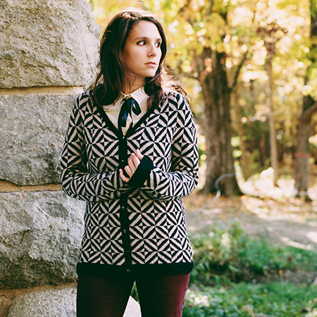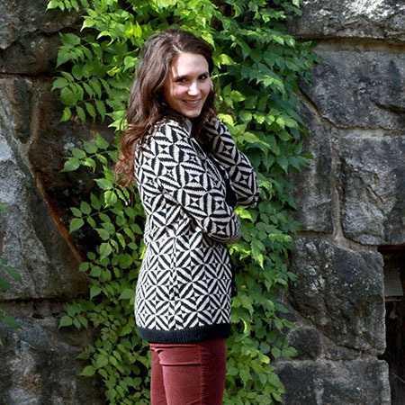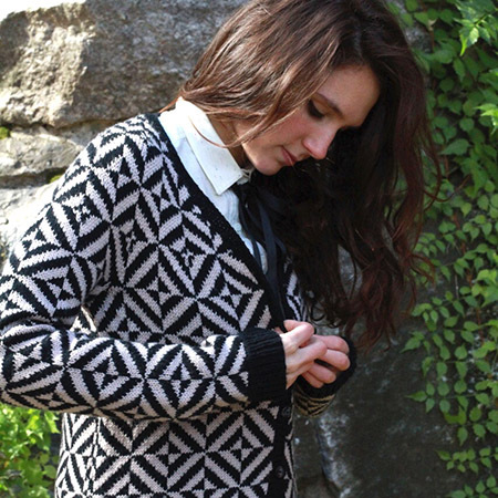 This dazzling v-neck cardigan is an undeniable showstopper. The design features a graphic all-over stranded colorwork motif that is worked in the round and steeked. Except for the edging, the entire cardigan is worked from a chart, however the rhythmic motif is very easy to memorize. In fact, you’ll probably find yourself referring to the chart only periodically. The cardigan is worked seamlessly from the bottom-up, with gentle hip shaping and a beautiful tapering yoke-style shoulder construction.