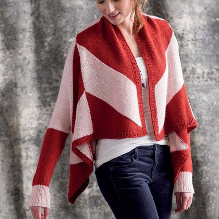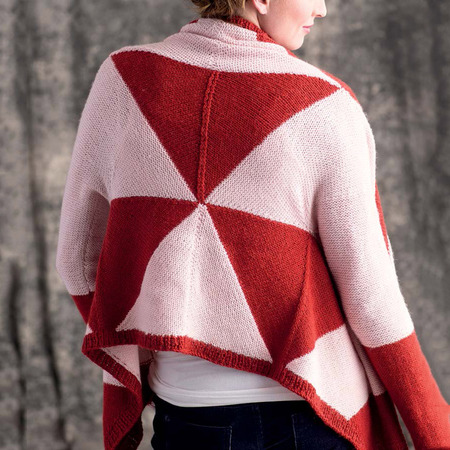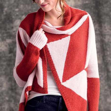 gives the illusion of intarsia blocks, but with much cleaner diagonal lines. The open draped front can be worn in a variety of ways by buttoning the corners to hidden buttons behind the shoulder inside the cardigan.
