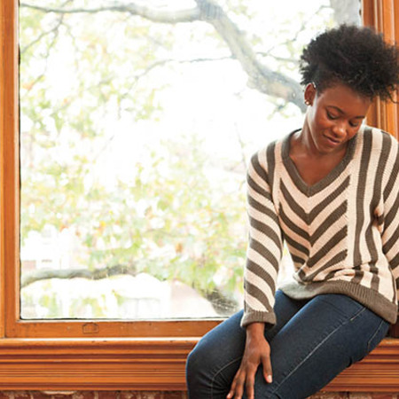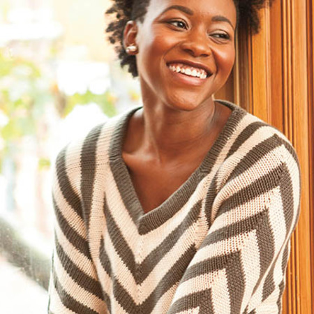 This fun and interesting to knit pullover design features a multi-directional stripe pattern. V-shaped stripes in the front are framed by vertical stripes on the sides, for a visually slimming effect. The shaping of the front panel creates a stretchy bias fabric, which drapes over any figure in a flattering way. Seams are avoided by working picked-up stitches to connect the various sections and using the 3-needle bind-off technique. The cropped sleeves are worked from the top down for easy length adjustment. A central decrease runs from the shoulder to the wrist, creating an extremely stretchy bias fabric that is fitted to the arm from elbow to wrist, making this updated dolman style very easy to wear. Stockinette turned hems give a soft finish and create essential structure to this soft drapey garment.