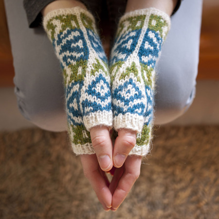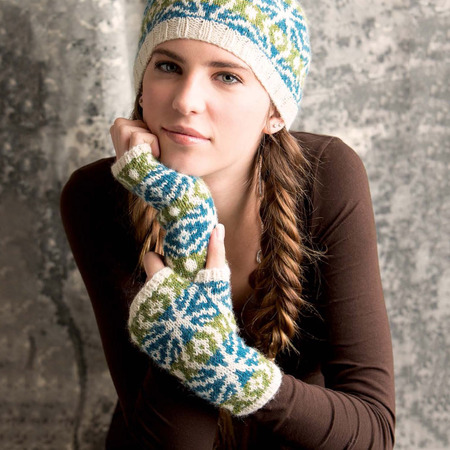 These Fair Isle mitts feature a cheerful geometric color work motif. Fingerless mitts are a great transition accessory for when it’s not quite cold enough outside to warrant gloves. I have also been known to wear mine in the summer at the office, when the air conditioner is blasting! The color work motif coordinates with the Woodstar Beret (see page 52).